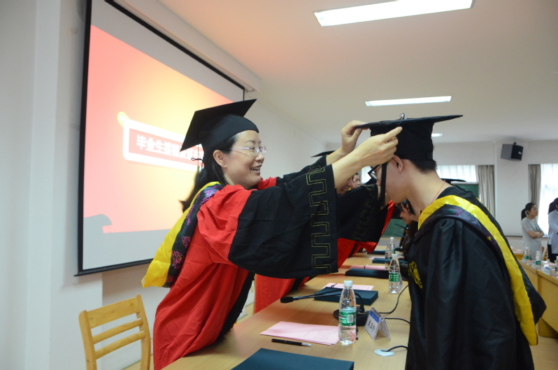 学院领导为获得博士、硕士、学士学位的同学扶正流苏并颁发学位证书。毕业典礼结束后,学院领导、导师与毕业生们合影留念。