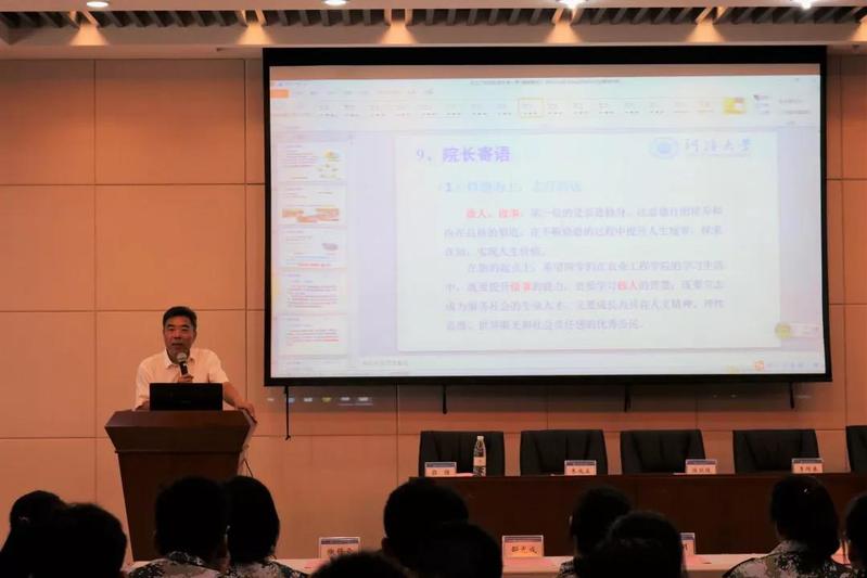 稍事休息之后,李同春院长给新生们讲授开学第一课,说明了农水的历史是光辉的,前景是光明的,同学们首先应该树立专业自信。之后,李同春院长从农水的学科沿革、师资队伍、学科方向、机构设置、重要成果、人才培养、机遇与挑战等方面让同学们对学院及专业有了基本认识。最后,李院长深情寄语18级学子,一个人要修德为上,志存高远;修学为要,励精图治;修身为本,励志笃行;善于创新,迎接挑战。