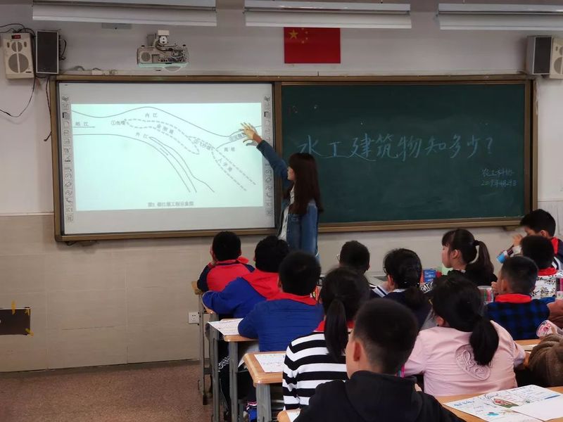 首先进行宣讲的是徐筱洋同学,简单自我介绍之后,她讲解了水工建筑的种类以及水工建筑的构成。期间,徐筱洋同学特别提到了大家常听闻的“都江堰”,她向同学们提出了几个问题,同学们能够积极抢答,气氛很活跃。同学们的学习能力很强,都能快速记住所教的内容并且踊跃举手回答提问。