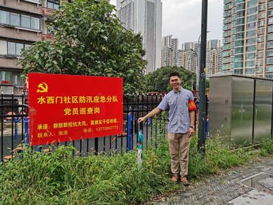 目前,外秦淮河水位缓慢回落,但由于堤防长时间处于高水位浸泡,土体潮湿,稳定性差,堤身抗剪能力低,仍存在出险的可能。两位同学在水西门社区防汛应急分队工作人员的带领下,对秦淮河堤进行防汛抗洪安全巡查工作,仔细排查迎水坡、堤顶、背水坡、堤脚等部位有无裂缝、塌陷、崩垮、浪坎、脱坡、潮湿、渗水、漏洞、翻沙冒水等危险现象,并注意观察近堤水面有无小漩窝或流势变化。在城市河道的防汛抗洪工作中,社区工作者和城管人员在外秦淮河沿线拉起警戒线,并在堤顶的人行步道边上竖起“水位上涨、注意安全”的警示标语,但是仍有市民群众在水域附近垂钓、捕捞。遇到此类危险行为,两位同学上前劝解、疏导,并从所学专业的角度介绍洪水防御和安全防范的必要性。