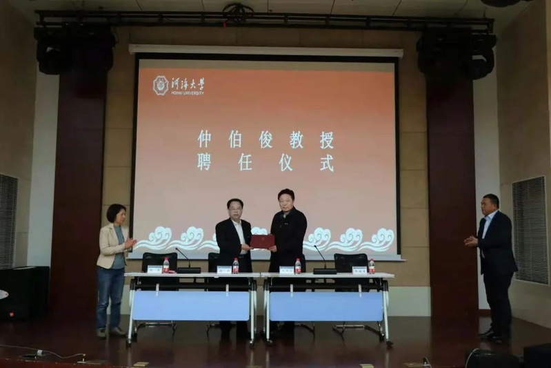徐辉校长对仲伯俊教授的到来表示热烈欢迎,为其颁发河海大学兼职教授聘书,并佩戴河海大学校徽。