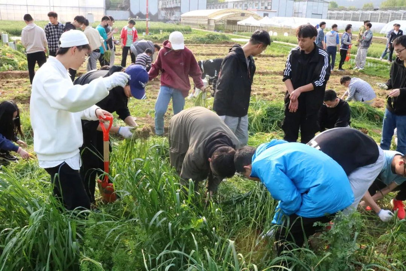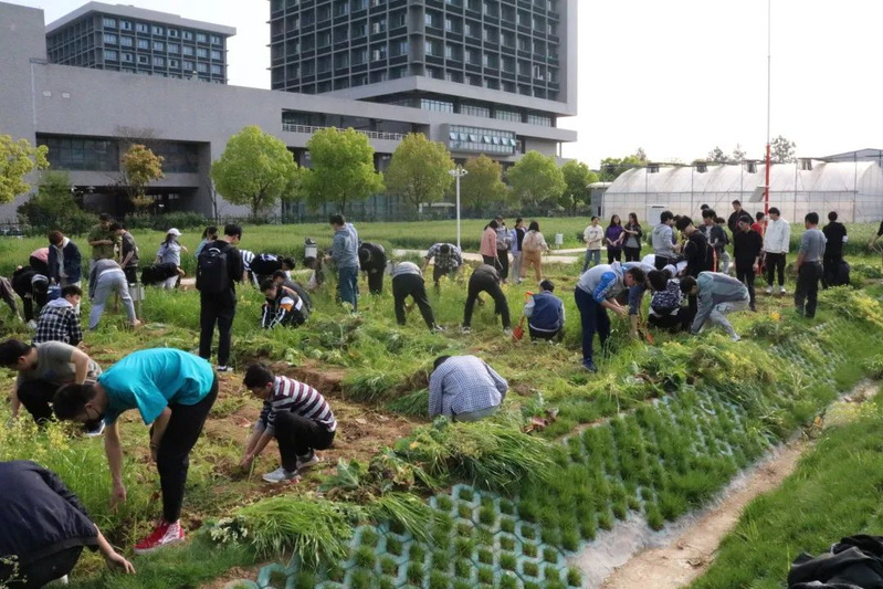 同学们在拔除杂草、整理土地的过程中认真努力、专心致志,遇到根系兼顾的草丛时会自发地进行良好的合作以便工作的顺利完成。