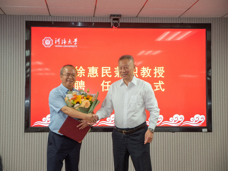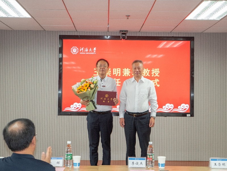 河海大学常务副校长李俊杰对王崇明研究员、徐惠民高工的到来表示热烈欢迎,为两位颁发聘书,并佩戴河海大学校徽。